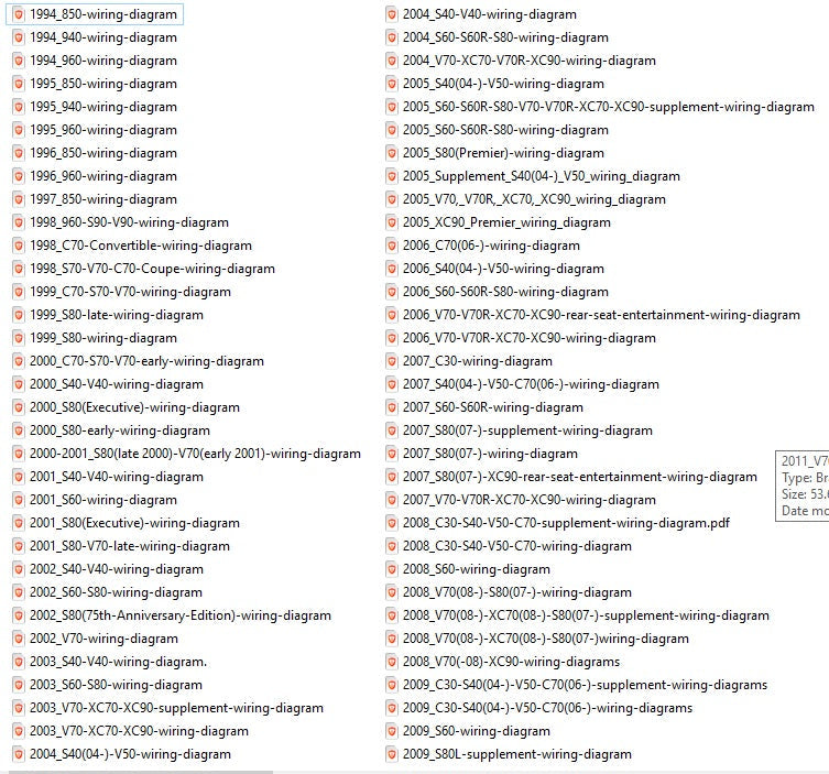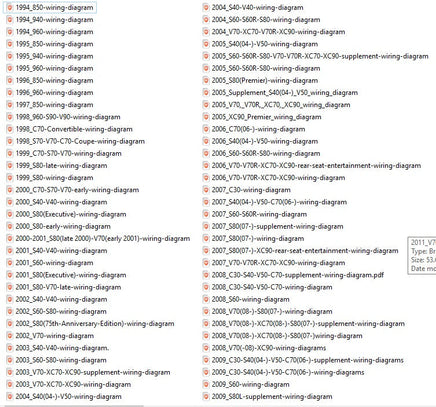 PDFs include all data for models 850, 940, 960, C30, S40, V40, V50, S60, XC60, V70/R, C70, XC70, S80/L, S90, V90, XC90.